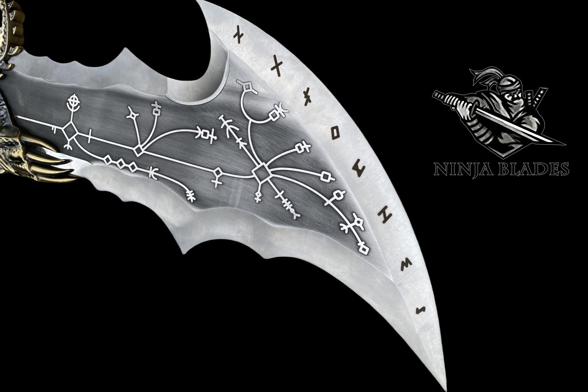 The blades are finished with a weathered silver coating, complemented by a menacing, clawed guard and a textured, wood-like hilt that captures the look of a weapon forged from divine metal and tempered by countless battles.