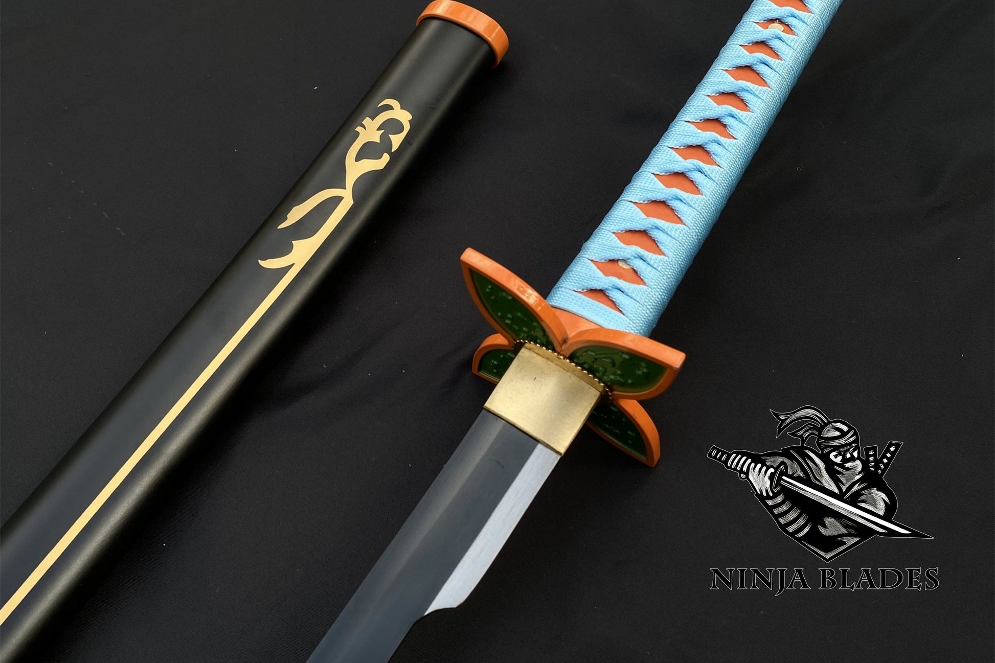 Saya: A glossy black scabbard with elegant gold decorative patterns and orange metal fittings, completing the refined and deadly aesthetic of Shinobu's weapon.